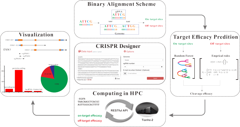 To support a large user volume, we have developed a parallel version of the CRISPR Designer and exported it to the Tianhe-2 supercomputer. Taking advantage of Tianhe-2’s massive computing power, CRISPR Designer can support over 200 simultaneous users and speed up the identification of potential target sites by conducting the computational task in multi-core CPU.